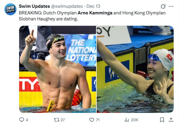 这是自媒体“游泳更新”的原创新闻。其实只有一句话:荷兰奥运选手阿诺德·卡明加和香港奥运选手史贝正在约会。两人最后一次与媒体见面是市贝全运会后的第一个赛事——香港公开水域比赛。士贝和卡明加都出席了,卡明加是受士贝邀请后专门参加的。巴黎奥运会结束后,卡明加出人意料地移居中国香港,师从石北队主教练汤姆·拉斯顿(Tom Ruston)学习。卡明加没有参加新加坡世锦赛,而是与香港队签订了一份特殊合同,成为该队的胸训搭档。市北的第二个项目蛙泳在全运会50米蛙泳中获得铜牌。两人在全运会前随香港队一起出现在帕维尔训练营。但真正体现两人关系非同寻常的是今年夏天他们在意大利度假。阿尔托虽然两人没有在 Instagram 上同屏,但假期的时间线和目的地是无法被欺骗的。连拍摄地点都是一样的(威尼斯里亚托桥附近)。事实上,即使没有这些互动,他们两个在一起看起来也很正常。他在东京奥运会上获得100米自由泳和200米自由泳双银,卡明加获得100米自由泳和200米自由泳双银。他们看起来是完美的搭配。卡明加参加了刚刚结束的短池欧洲锦标赛,但现在荷兰男子蛙泳的头号选手不是别人,正是科尔博。也就是说,现在真正配得上秦海洋的应该是科尔博,而不是三十岁的卡明加。但爱意味着什么? !在卡梅加的Instagram上,除了家人、队友和同龄人,他只入境了这个国家。石贝的Instagram看起来就像一个孤独的战士。未来可能会增加新鲜、直播的内容!